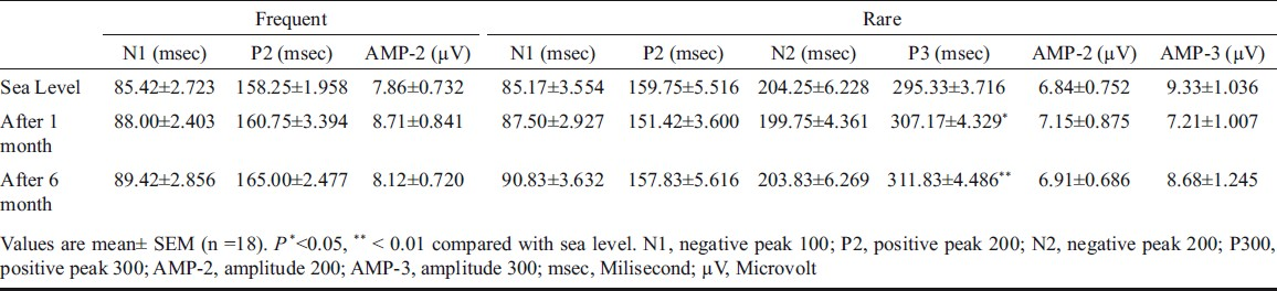 The latencies of peaks N100, P200 and N200 waves did not show any significant changes after 1 and 6 months of stay at HA as compared to SL. The P300 latency was significantly delayed after 1 month and further delayed after 6 month of residence at 4115 m. The P200 and P300 amplitudes did not show any changes.